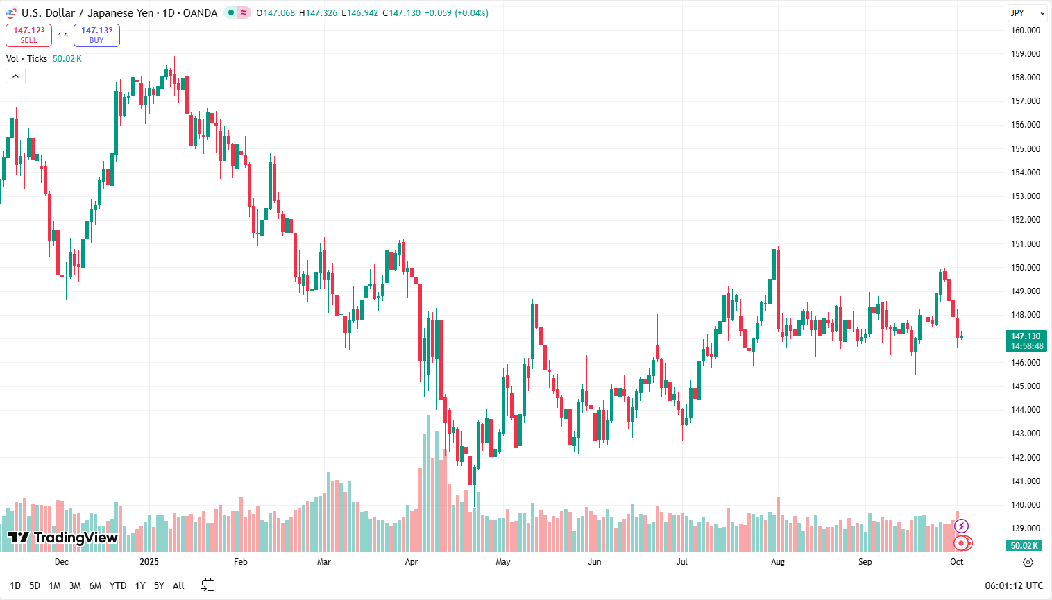 Analysts indicate that market sentiment has been conditioned by two opposing forces: a subdued response to the potential US government shutdown, keeping a positive tone in the risk scene and the expectations of the policy direction of the Fed. The two additional Fed cuts that investors can expect this year limits the potential of the dollar to rise. This apprehensive background has limited the USD/JPY recovery to 153.91, and traders have seen any advance towards the 148.00 level as a sell into strength and not turning point.