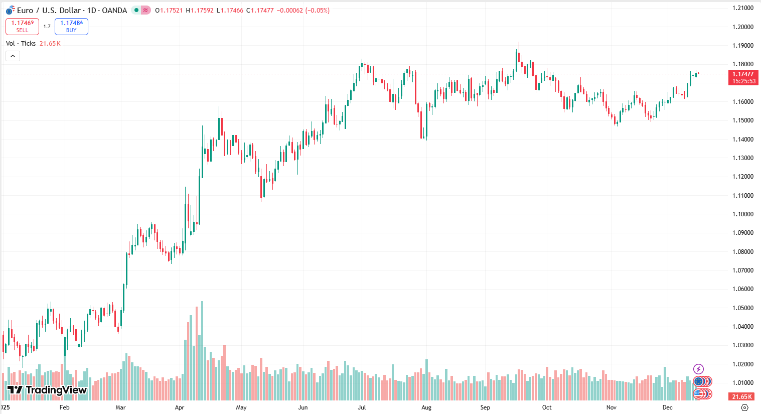 EUR/USD is holding near 1.1750 in early European trade, consolidating just below recent two-month highs as markets digest fresh euro-area data and brace for key US labour releases. The pair remains underpinned by last week’s less hawkish Federal Reserve (Fed) decision, though near-term direction is increasingly data-dependent on both sides of the Atlantic.