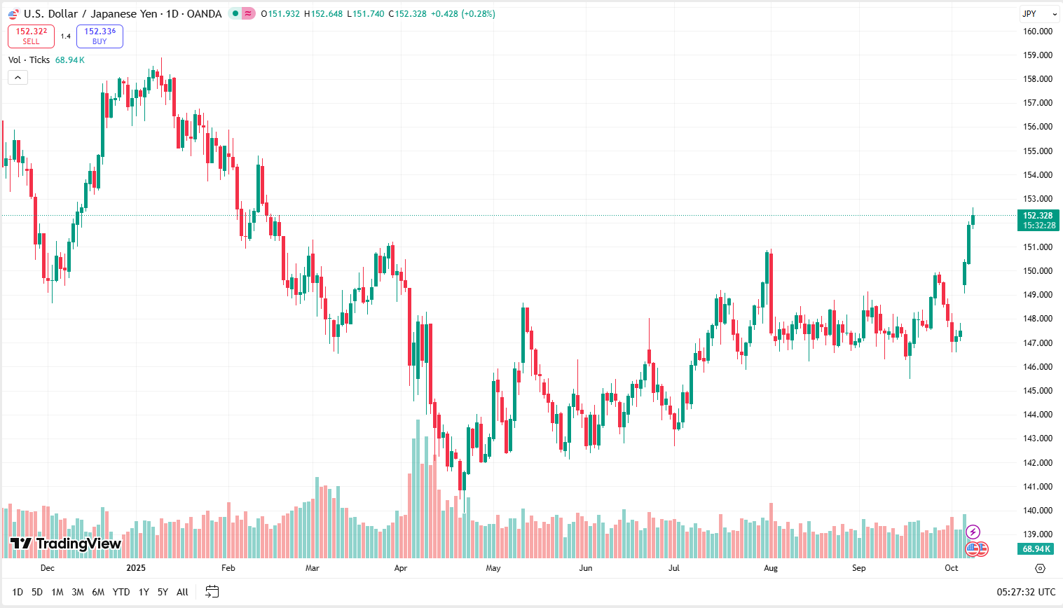 The USD/JPY pair traded with a mild bullish bias and traded around 152.00 in Wednesday’s Asian session, as safe-haven demand for the Japanese yen remained subdued despite political tensions in Europe. The US dollar is thought to have been supported by a wary mood before the issue of the FOMC Minutes later in the day, with traders speculating on the effects of a protracted US government shutdown and the effect that the shutdown might have on the economy. The risk-sensitive Yen was gaining modestly because investors were waiting to get clear policy guidance by the Federal Reserve and the Bank of Japan (BoJ).